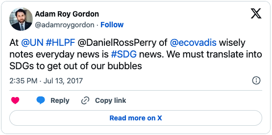 I’m in New York City this week, representing EcoVadis at a workshop at the United Nations Headquarters during the UN High Level Political Forum (HLPF). The workshop, titled “Business Leading the Way: The SDGs as a Tool for Sustainability and Growth”, has been co-organized by the UN Department of Economic and Social Affairs (UNDESA), the Sustainable Development Fund (SDGF), and the United Nations Institute for Training and Research (UNITAR), with the generous support from EcoVadis.