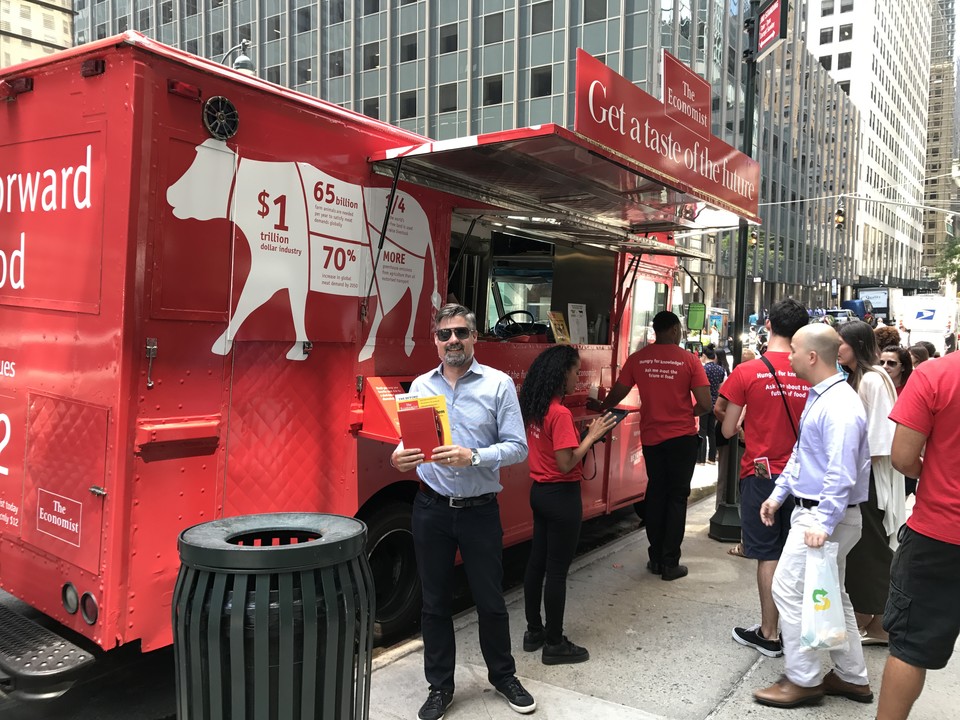 I think this image of me holding my new copy of the weekly magazine, along with a “free” Moleskine® inspired notebook, speaks volumes about how The Economist has managed to corner a significant demographic (Manhattan-based New Yorkers, hungry enough to eat anything from a street-vendor, and willing to listen to a sales-pitch for free food).